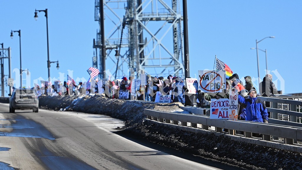 By 12:30 p.m., dozens of people had gathered at the intersection near the Bath post office and the base of the Sagadahoc Bridge carrying signs that read, “Fire Hegseth” and “Maine doesn’t welcome war criminals.” Dozens of others waved American flags in support.